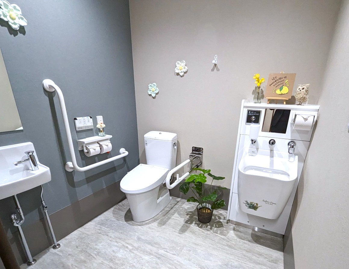 共用部にはオストメイト対応のトイレを整備。スペースに余裕があり、車椅子・杖を使用している方が利用しやすい設計です。