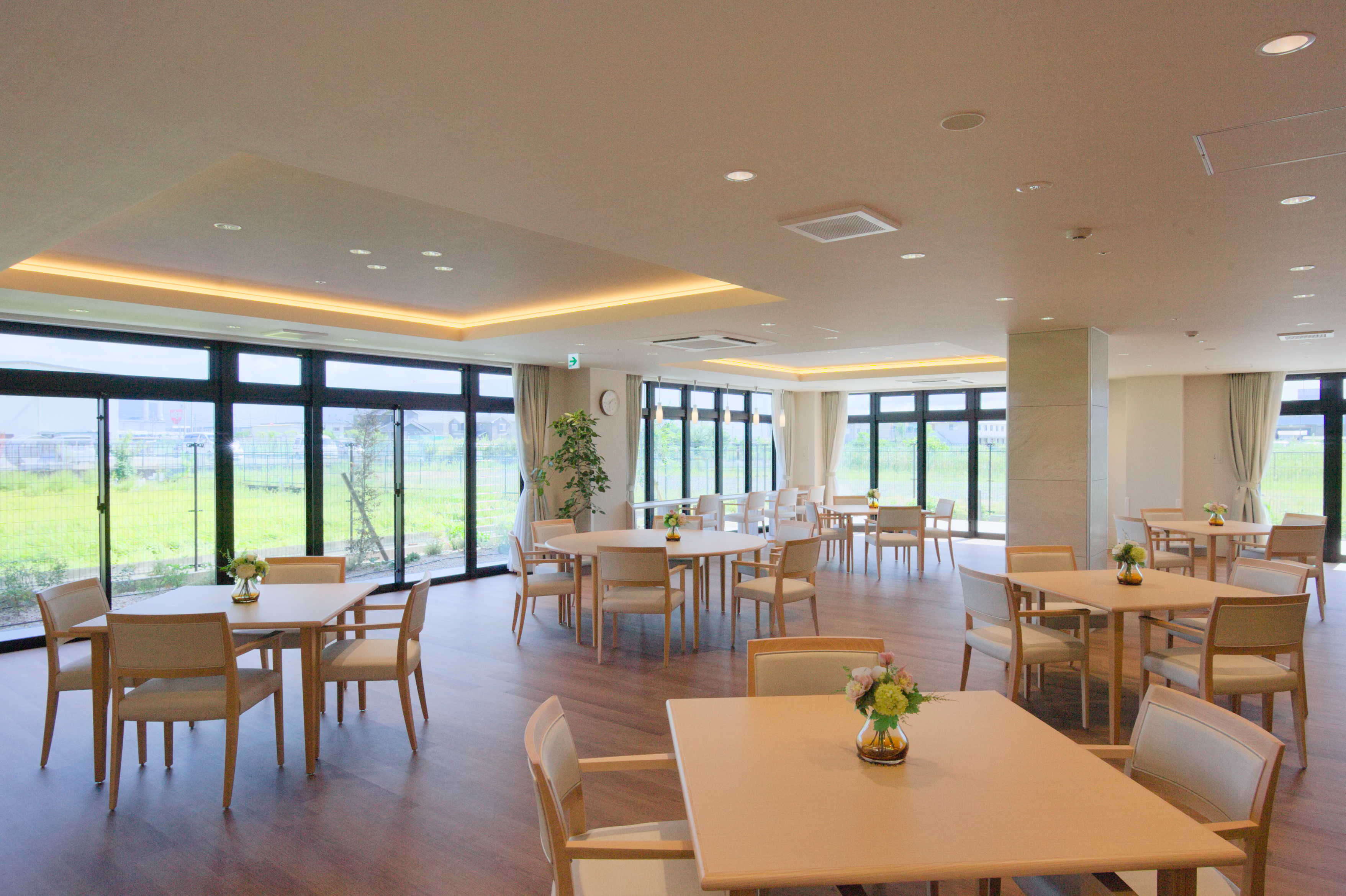お食事や交流をお楽しみいただける空間です。窓から明るい光が入り込む空間で、入居者様とコミュニケーションを取りながら楽しくお過ごしいただけます。