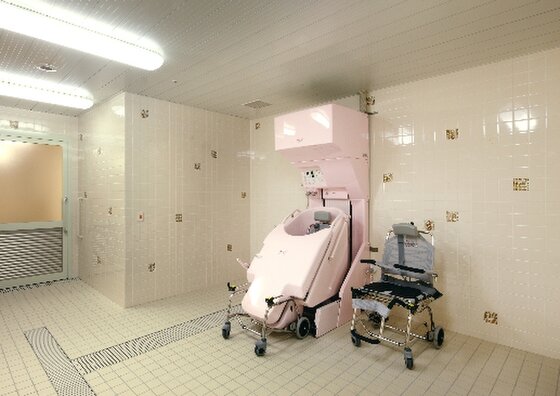 介護度が高い方も安全にご入浴いただける機械浴を設けております。一つ一つの動作の前には丁寧な声掛けを行っており、安心してご利用いただけます。