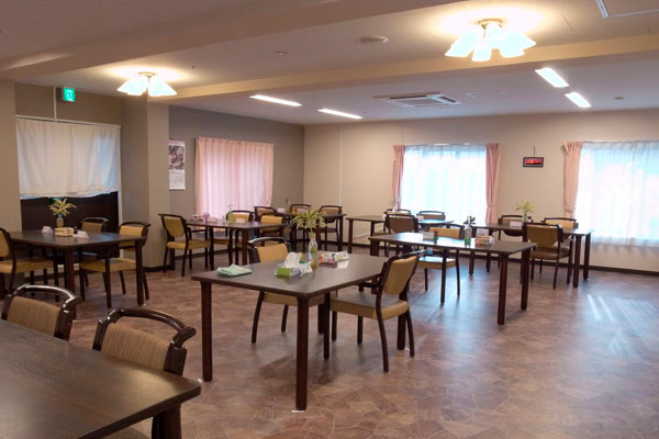 開放的な明るい食堂で、テーブルとテーブルの間には十分なスペースを設けている為車いすの方もスムーズなご移動が可能です。