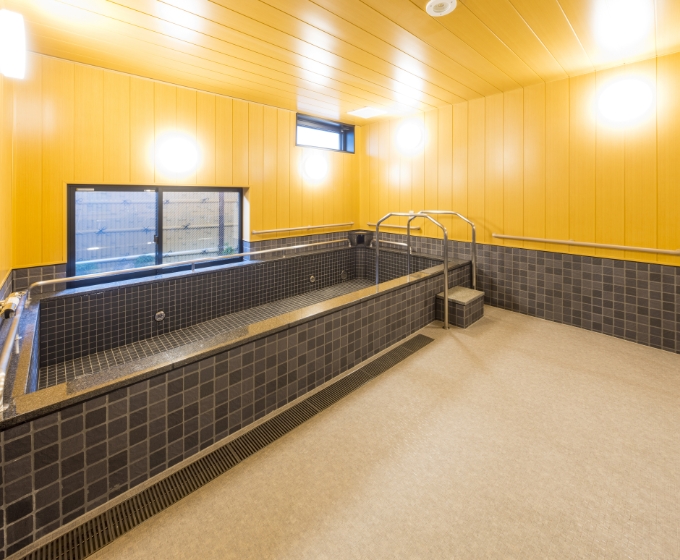 広々とした大浴場を設けております。大きな浴槽で足を伸ばして心身ともにリラックスしていただけます。手すりが設備された安全な空間です。