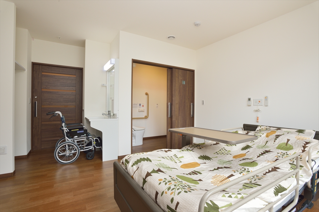 居室内は車椅子の方も快適にお過ごしいただける十分な広さを設けております。洗面台は車椅子の方も使いやすい設計となっております。