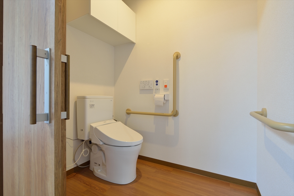 手すりが設けられており、立ち上がりを安全に行っていただく事ができます。緊急コールボタンを設置しており、緊急時にもすぐに駆け付けれる体制が整っております。
