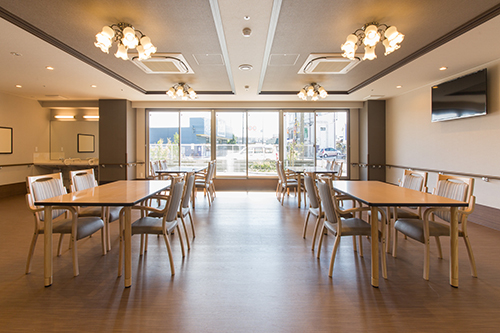 広々としたスペースを確保した食堂。毎日の楽しみであるお食事をゆったりと召しあがっていただけるよう配慮しております。