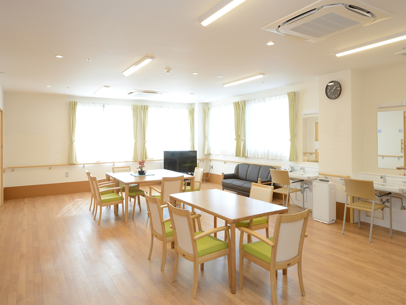 ゆったりとしたソファや食事を楽しめるダイニングテーブルが配置された明るい共有スペースです。快適で穏やかな日々を送ることができる環境となっております。