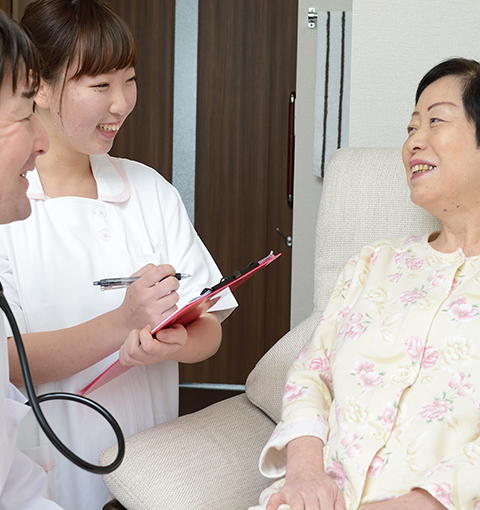 かかりつけ医や訪問看護との連携により健康管理を行う安心の医療体制。常にスタッフや関係者がご入居者様の心身の状態を情報共有した上で、ご本人様やご家族のご要望にお応えしながらチーム体制で健康管理を行います。定期的に医師が往診し、現在治療中の方の診察のみならず、予防的な観点からもケア。加えてご入居者様お一人お一人の情報は、看護師やスタッフとも共有します。
