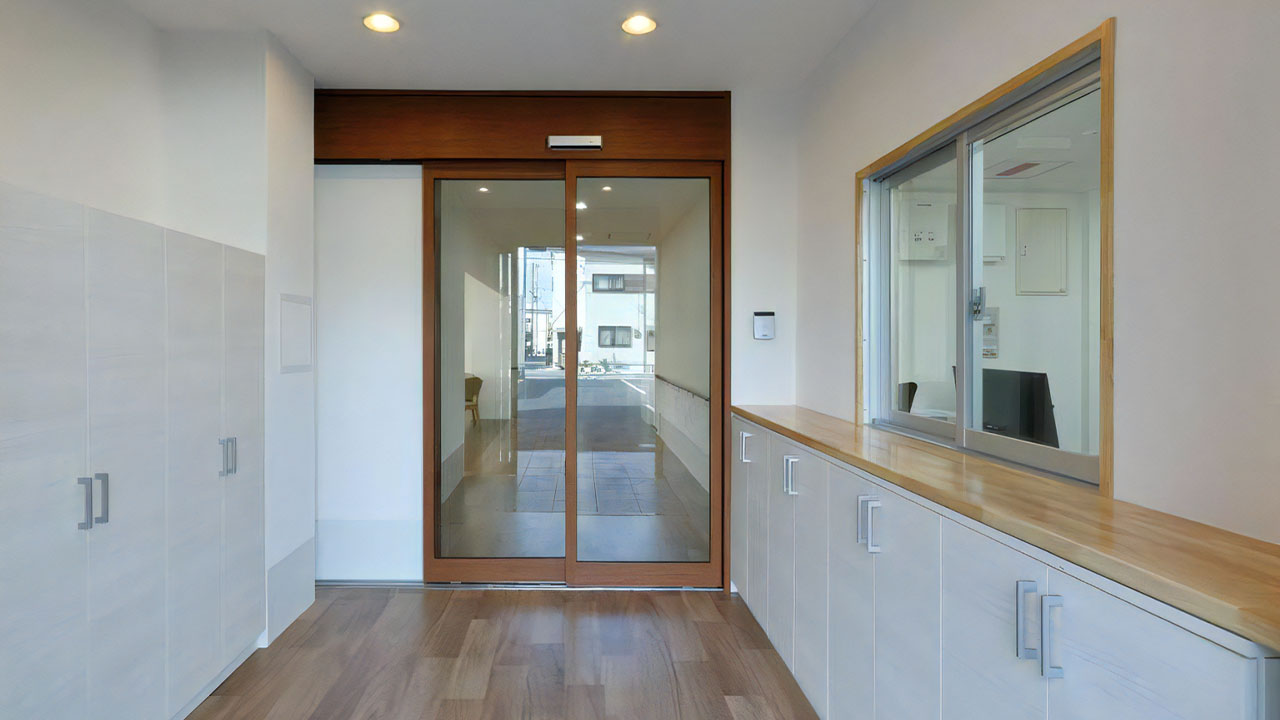 バリアフリーの玄関には受け付けがあり、入出者のチェックなどセキュリティーは万全の体制で運営しております。