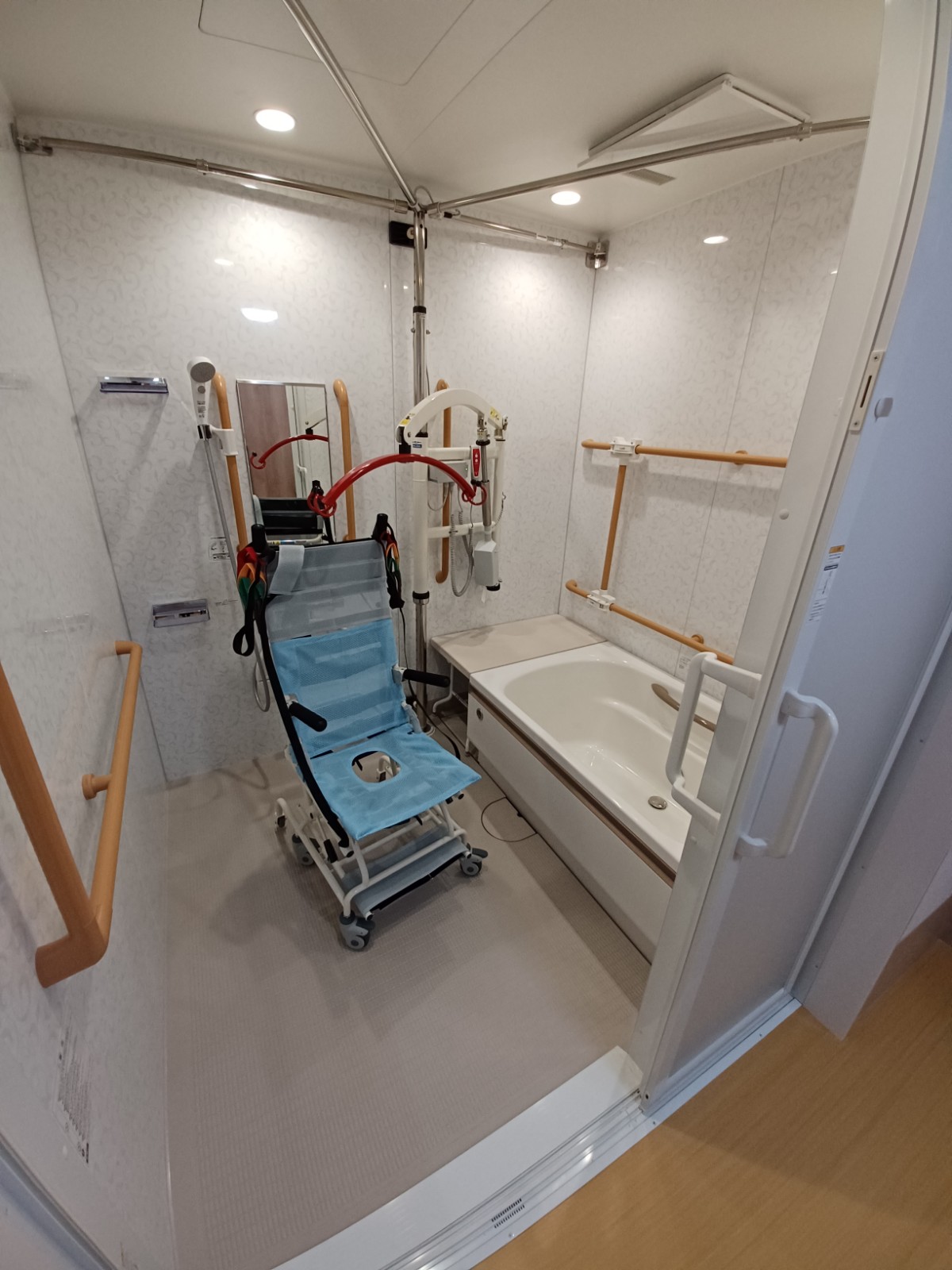 広々とした浴室はバリアフリー設計で、安全にご利用いただけます。快適な入浴をお手伝いします。