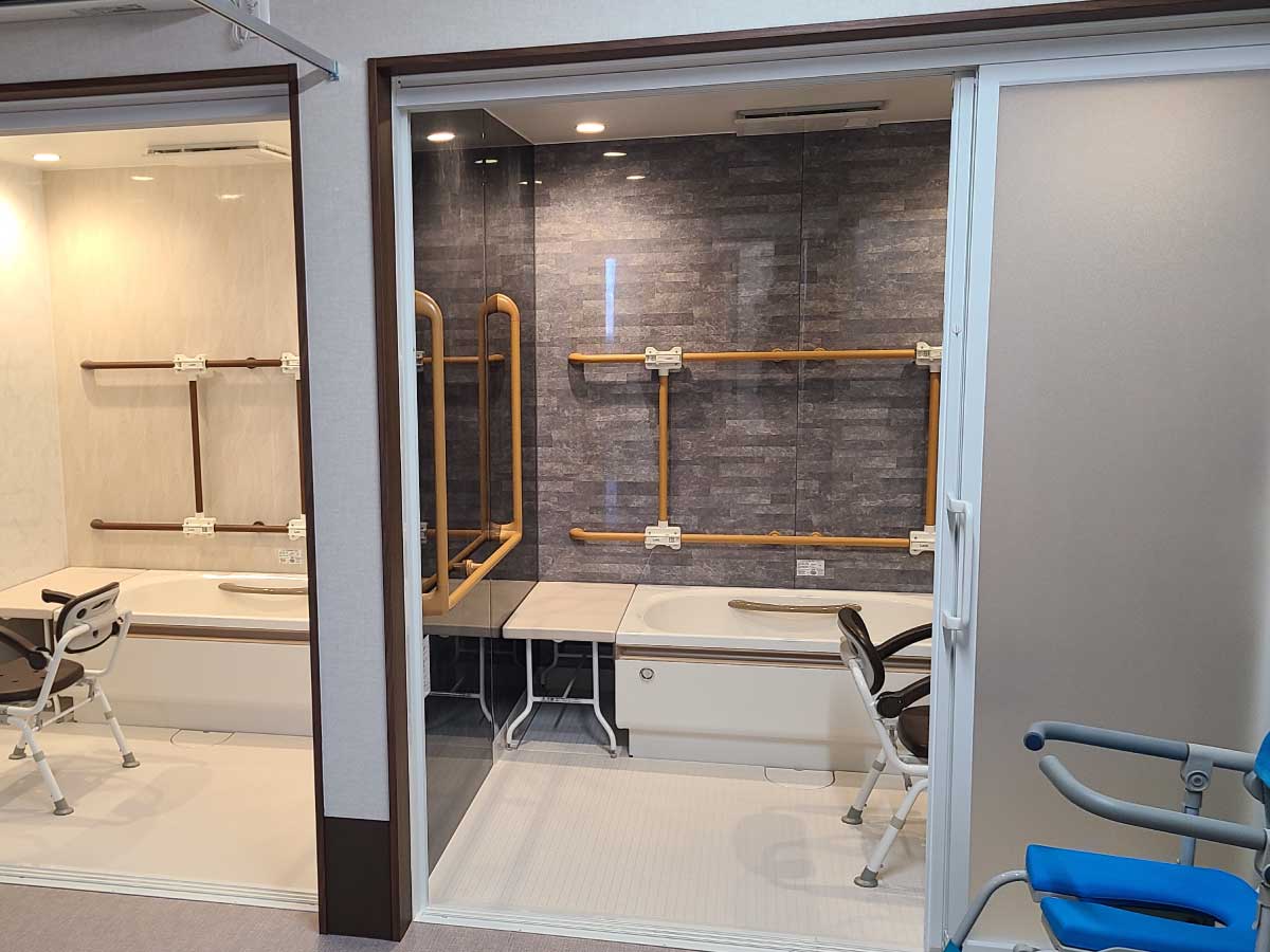 車椅子の方でも安全に入浴や着替えができる脱衣室と浴室が、1階には4室と南棟2階に一室ご用意しております。