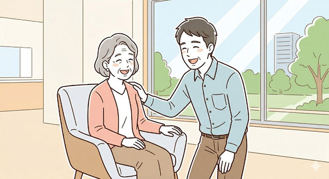住み替え後、お母様は新しい環境にすぐ馴染まれ、何より遠方のため頻繁に行けなかった面会が「週に一度」可能になったことで、親子間のコミュニケーションが劇的に増えました。長男様からは「顔を見に行くのが楽しみになった」と感謝の言葉をいただきました。支える側の負担を軽減することが、結果として「長く続く安心な介護生活」に繋がった成功事例です。