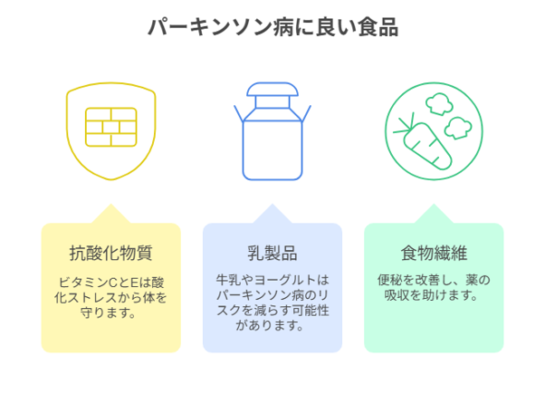 パーキンソン病の症状の一つである「便秘」の改善に不可欠です。便秘は薬の吸収を妨げることもあるため、積極的に摂取しましょう。